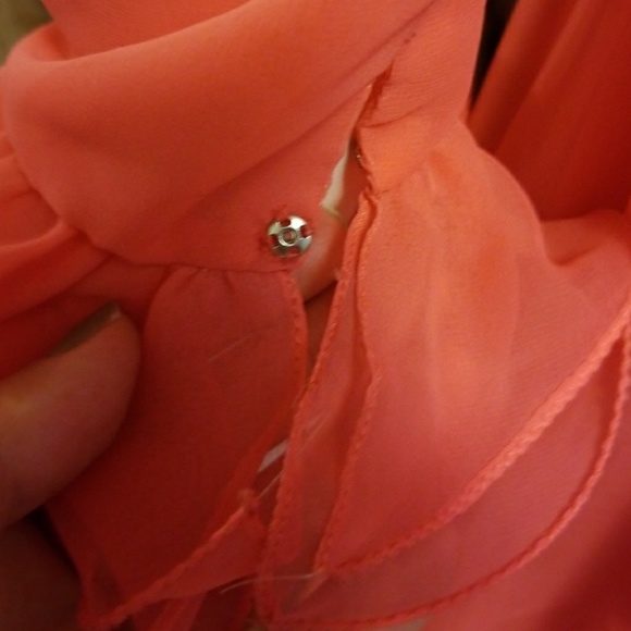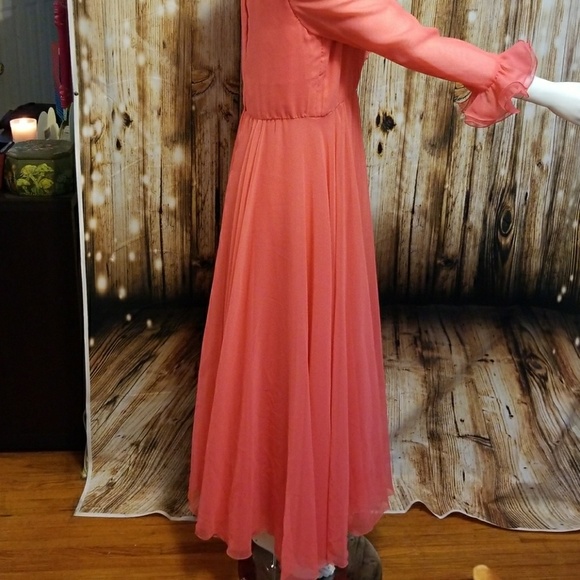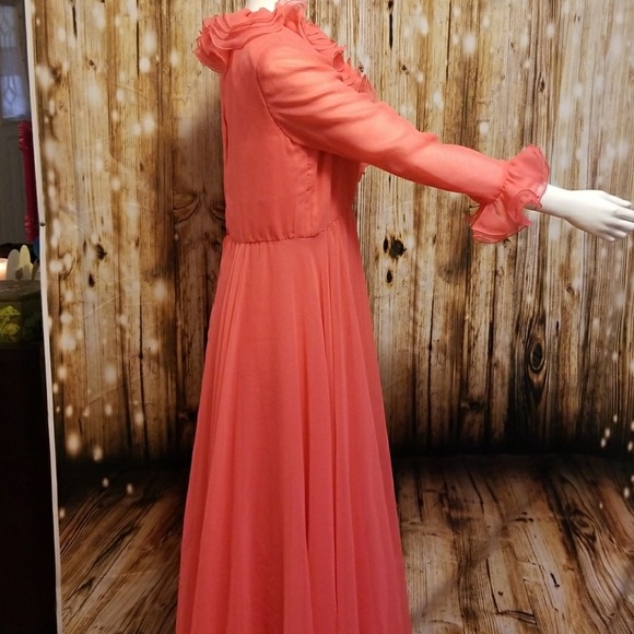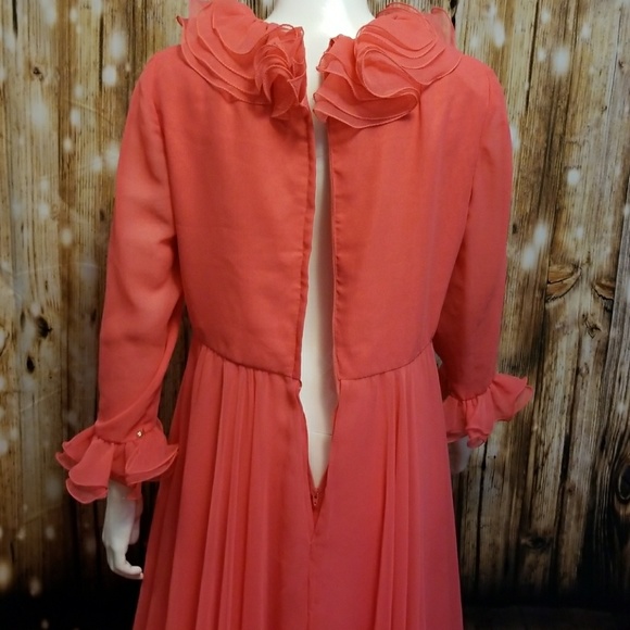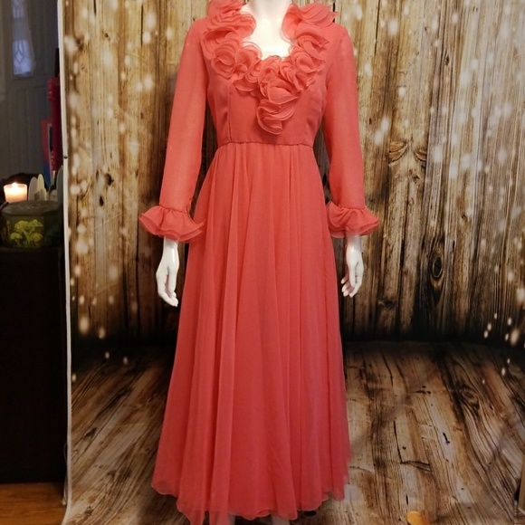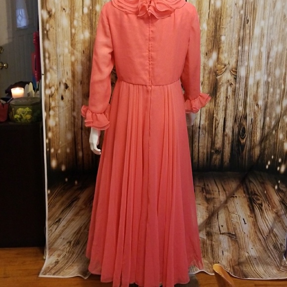 Circa 50s. Lou Lattimore of Dallas coral pink supper club gown: ruffles along neck line and wrists, hidden back zip, chiffon overlay with sheer sleeves, full skirt. EUC. No size tag. No material tag. Tagged size based on measurements and is approximate. Bust- 18″ flat. Waist- 16″ flat. Hips free.Length- 54″.
