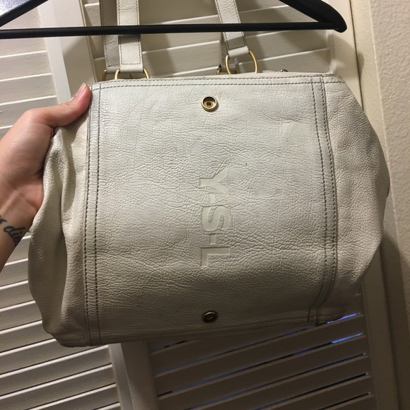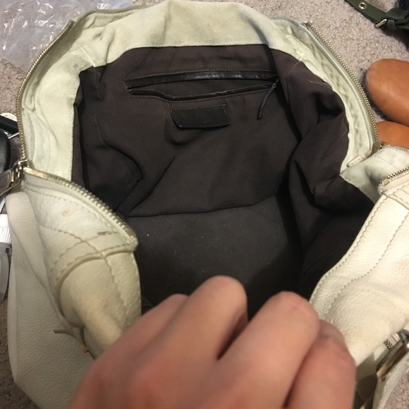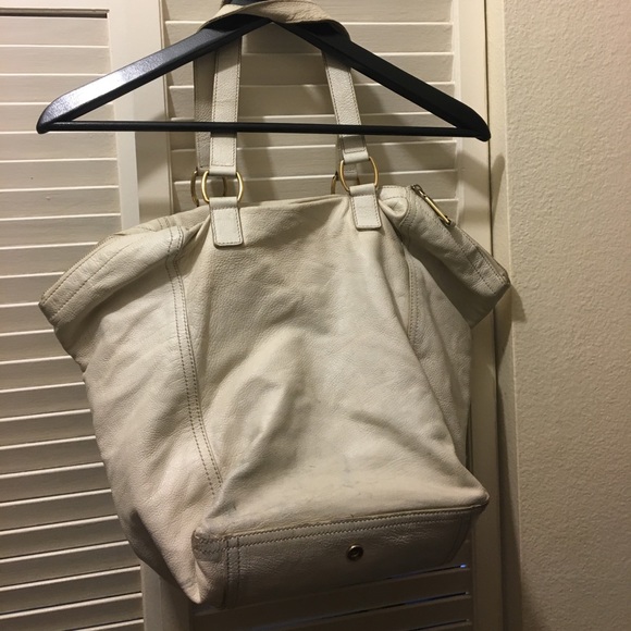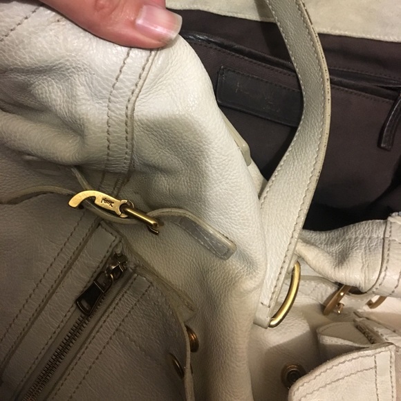 I’ve owned this bag for over 7 years so it is definitely loved. Cream leather with gold hardware. Corners are a bit worn. Exterior does have wear and some stains. Interior I’ve kept fairly clean. Again, I’ve used this bag for over 7 years.
